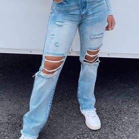 High Waist Frayed Hem Ripped Jeans